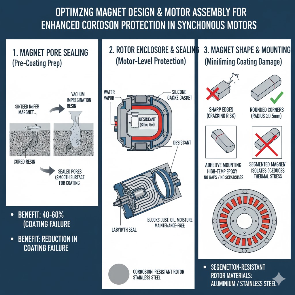 Salutan permukaan sahaja tidak mencukupi—pilihan reka bentuk untuk pemasangan magnet dan motor memainkan peranan penting dalam meminimumkan risiko kakisan. Pengoptimuman ini melengkapkan salutan dan memanjangkan jangka hayat magnet: