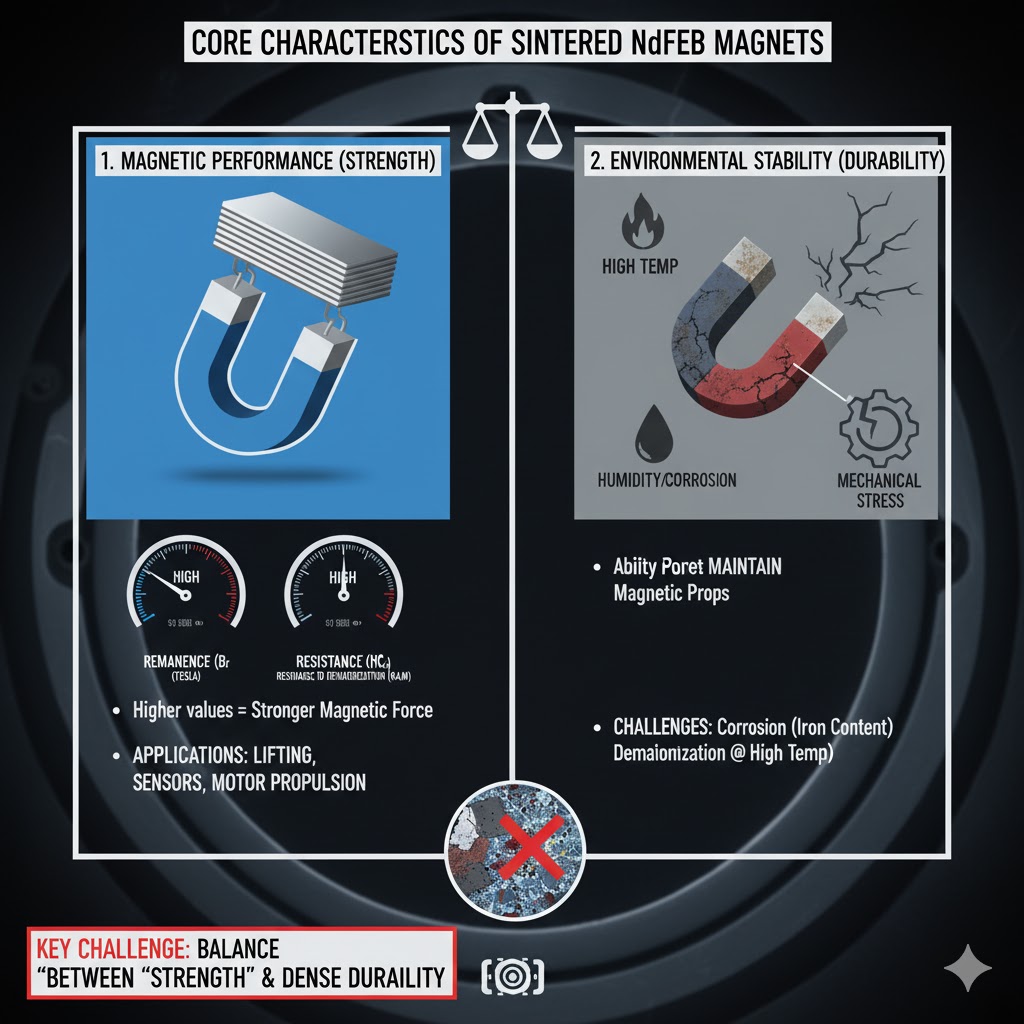 Magnet NdFeB (Neodymium-Iron-Boron) tersinter ialah antara magnet kekal terkuat yang ada, digunakan secara meluas dalam industri seperti elektronik, automotif dan tenaga boleh diperbaharui. "Ciri teras" mereka berkisar pada dua sifat yang bercanggah lagi kritikal: prestasi magnet dan kestabilan alam sekitar. Prestasi magnet ditakrifkan oleh metrik seperti remanens (Br, ketumpatan fluks magnet maksimum) dan coercivity (HcJ, rintangan kepada penyahmagnetan)—nilai yang lebih tinggi bermakna daya magnet yang lebih kuat untuk tugas seperti mengangkat, pengaktifan sensor atau pendorongan motor. Kestabilan, sebaliknya, merujuk kepada keupayaan magnet untuk mengekalkan sifat ini dalam keadaan yang teruk: suhu tinggi/rendah, kelembapan, kakisan atau tekanan mekanikal. Magnet NdFeB tersinter tradisional secara semula jadi terdedah kepada kakisan (disebabkan kandungan besinya) dan boleh kehilangan kemagnetan pada suhu tinggi, menjadikan keseimbangan antara "kekuatan" dan "ketahanan" cabaran utama bagi pengeluar dan pengguna.