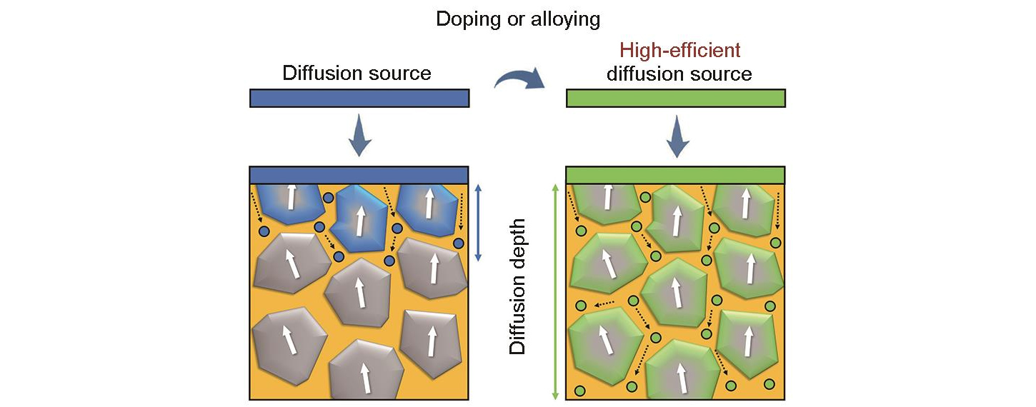 | Teknologi resapan sempadan bijian dengan nadir bumi yang berat rendah menggabungkan teknologi resapan magnetron dan teknologi resapan percetakan skrin. Menggunakan teknik ini, yang mengedarkan unsur nadir bumi berat kandungan rendah di sepanjang sempadan butiran, memperbaik kecacatan sempadan butiran dan mencapai peningkatan ketara dalam Hcj. |